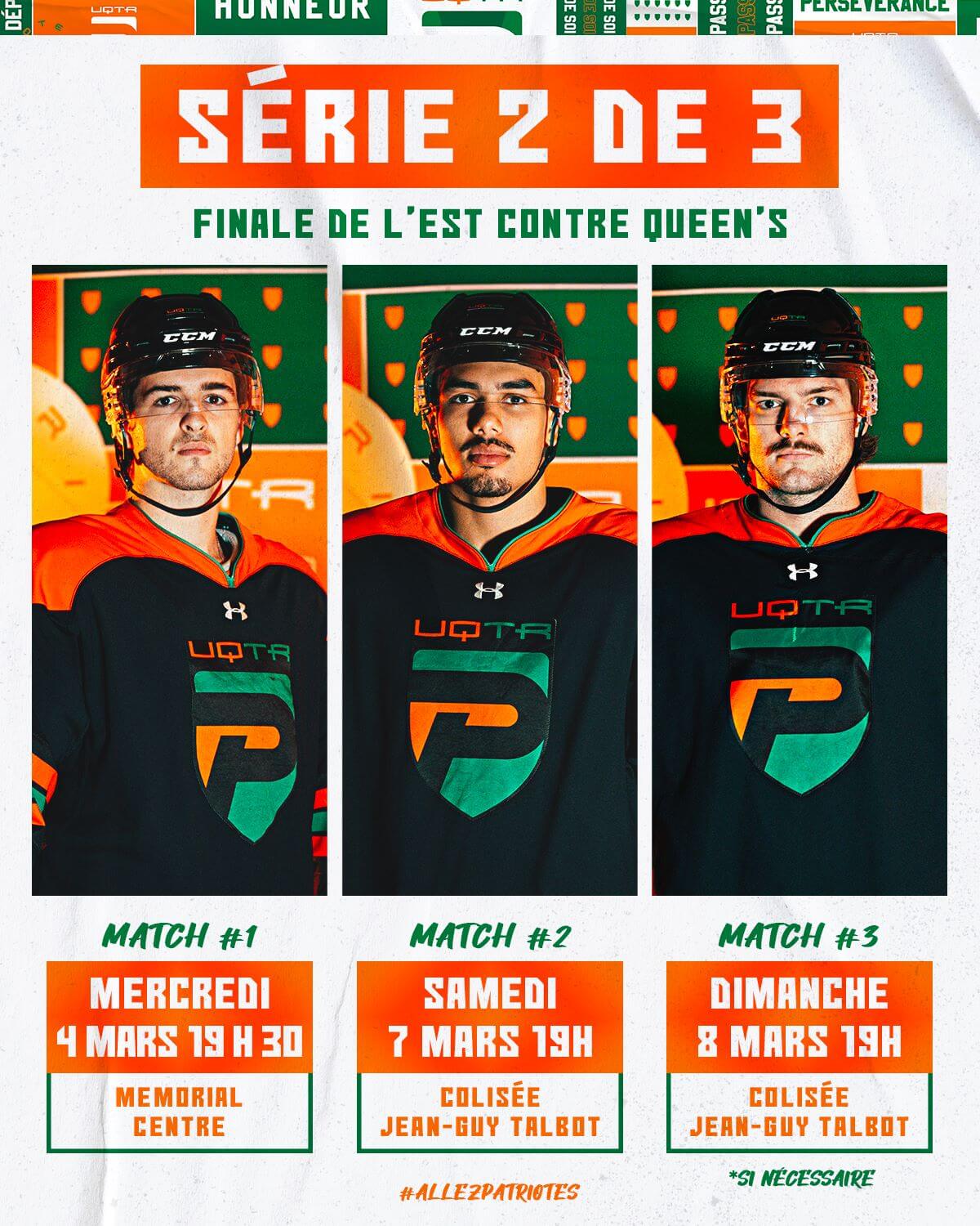 La série se transportera ensuite à Trois-Rivières pour le match no 2 ce samedi à 19 h, au Colisée Jean-Guy-Talbot. Si un troisième duel est nécessaire, il aura lieu ce dimanche 8 mars à 19 h, toujours devant les partisans trifluviens.